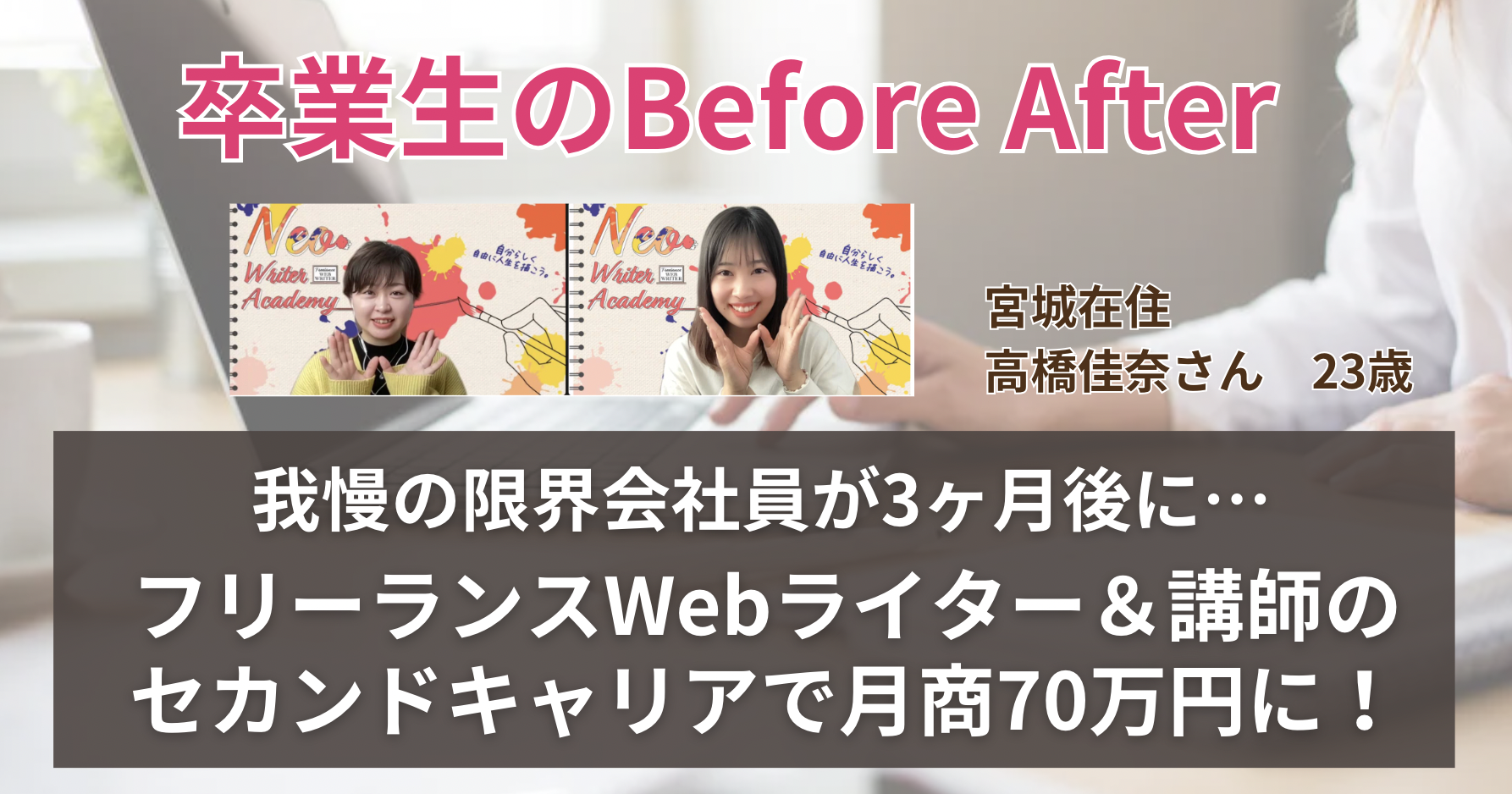 そんな佳奈さんはたった3ヶ月でフリーランスWebライターになり、講師へとステージアップ!セカンドキャリアを構築して月商70万円を叶えた♪