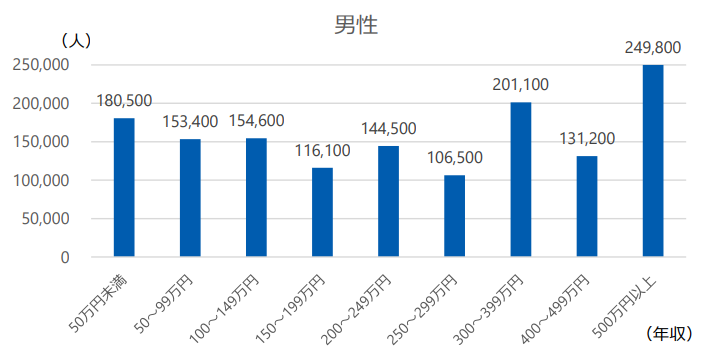 しかし、厚生労働省が令和6年に発表した「複数の事業所で勤務する者、フリーランス、ギグワーカーなど、多様な働き方を踏まえた被用者保険の在り方について」によると、男性フリーランスの年収は500万円以上の人が最も多いです。