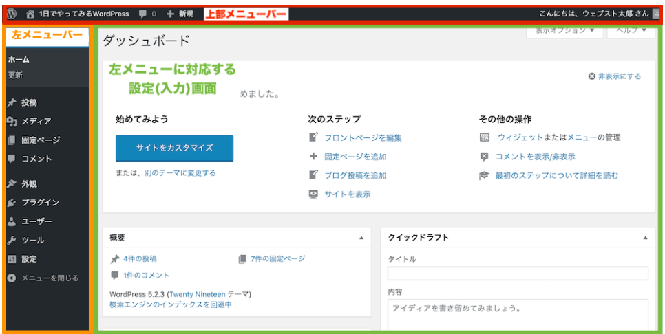 なかでも左メニューバーは固定ページや投稿の追加、編集などの重要な操作を行う場所なので、しっかりと使い方を覚えていきましょう。