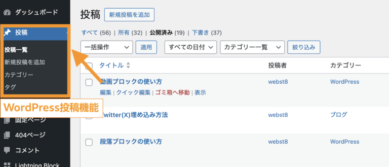 投稿とは記事を投稿する機能の事です。左メニューバーから選択すると、投稿一覧のページに移動します。