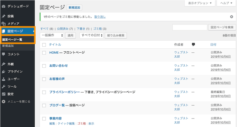 左メニューバーの固定ページを選択すると、固定ページ一覧に移動し、画面上にある「新規追加」ボタンから、新たな固定ページを追加できます。