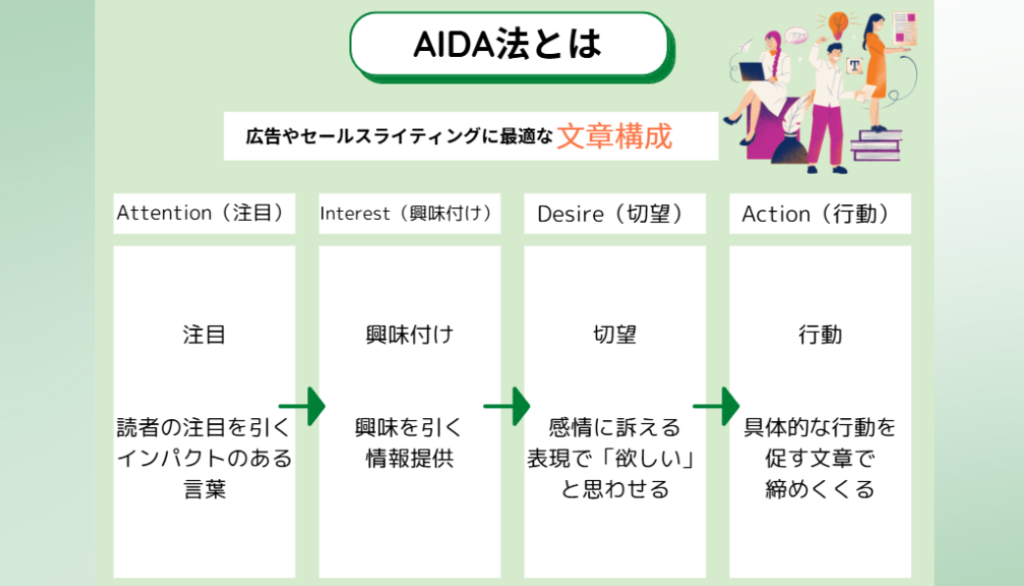 AIDA法は広告やセールスライティングに最適。読者を惹きつけ、行動(購入やサービスの利用)を促すことに特化しています。