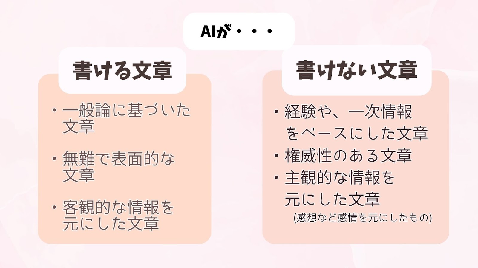 では、AIでも書ける文章と書けない文章はどのような違いがあるのでしょうか。
